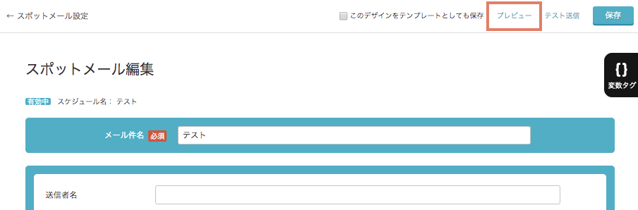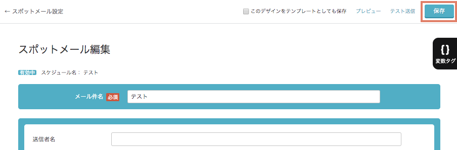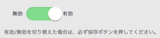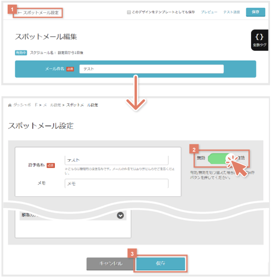 デザイン編集完了後は、通常のシナリオ・スポットメールと同様、プレビューとテスト送信内容を確認後、設定画面に戻って以下の「無効有効スイッチ」を有効にしてから、画面下部の「保存ボタン」をクリックします。