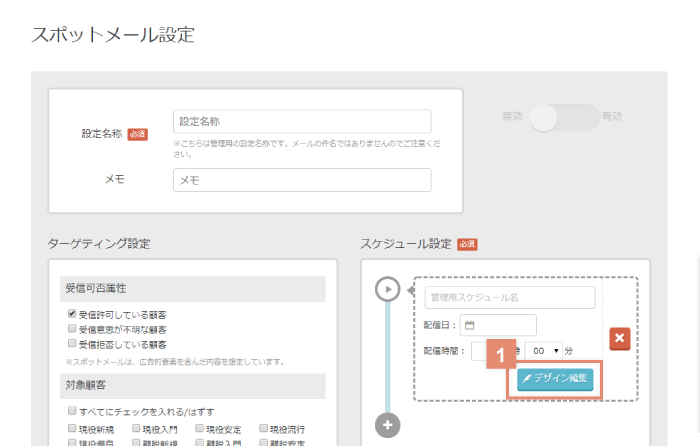 設定名称とメモ(任意項目)、ターゲティング設定(受信可否属性)、スケジュール名をセット完了後、画面下部の「保存ボタン」をクリックすると、通常のメール設定画面と同様に「デザイン編集ボタン」から、メールのデザイン編集画面に進めます。