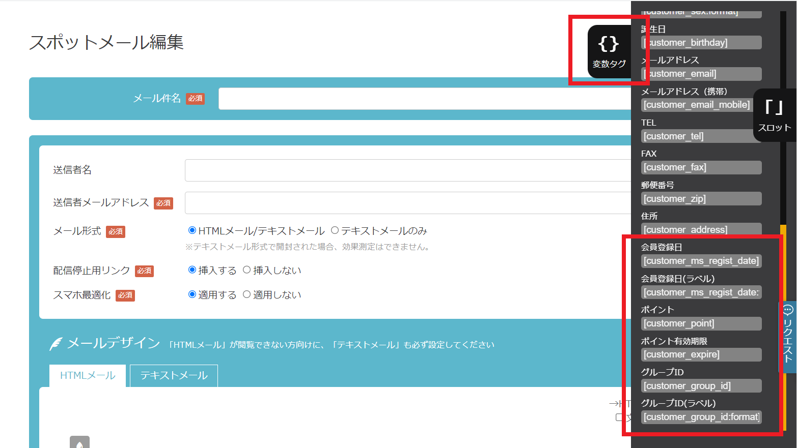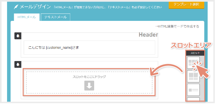 かご落ちメール専用のデザイン編集画面は、スロットを用いた「かんたん編集モード」のみ適用となっています。※ソースコードでのHTML編集モードは利用できません。