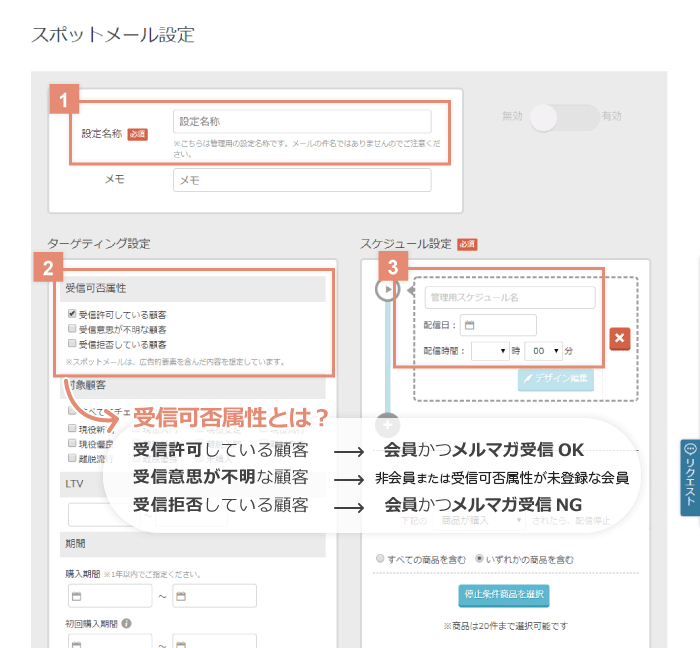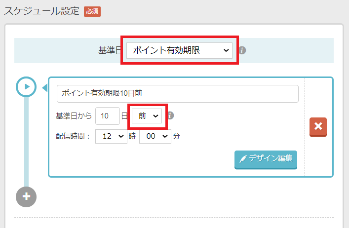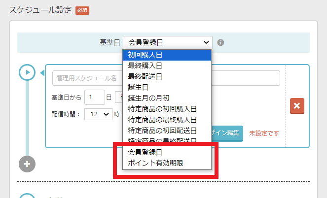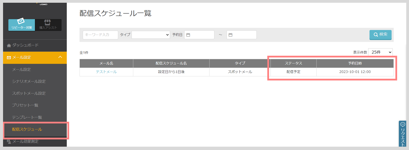 ・左メニュー:メール設定 > 配信スケジュール