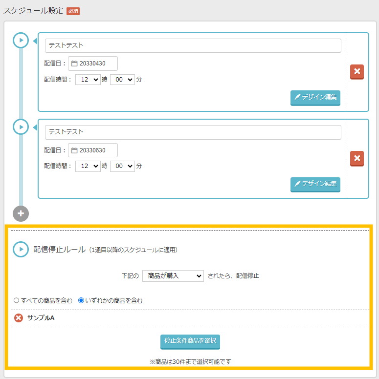メールデザイン編集画面で設定した件名と内容で、上記の通り最大2回配信(同一内容のみ)