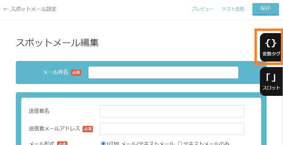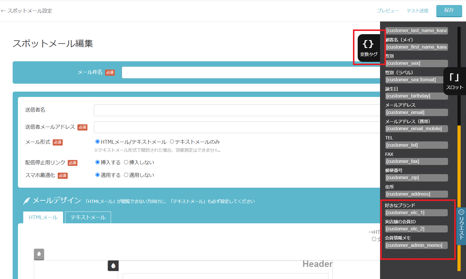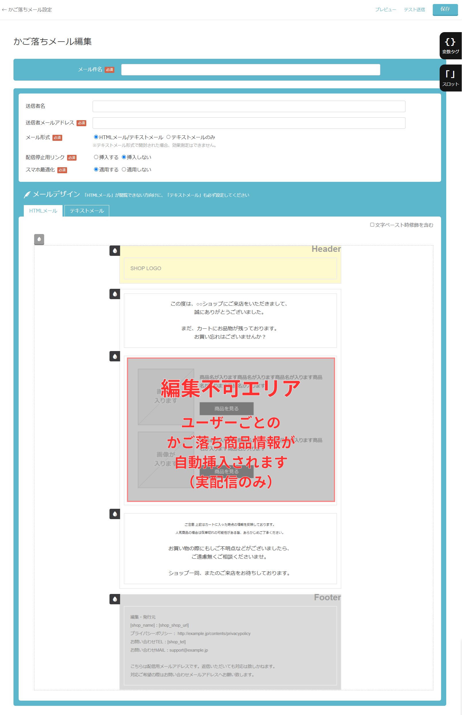 かご落ちメールは通常のシナリオ・スポットメールとは異なり、「編集不可エリア」があります。