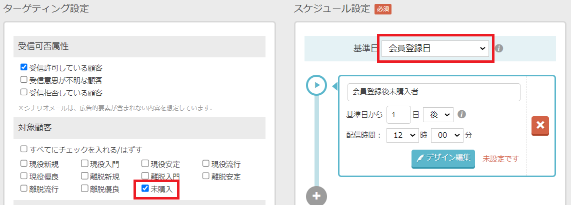 2)新規登録会員の場合には即時配信対象とはならず、24時間後に購入がない場合に配信対象に。 |
