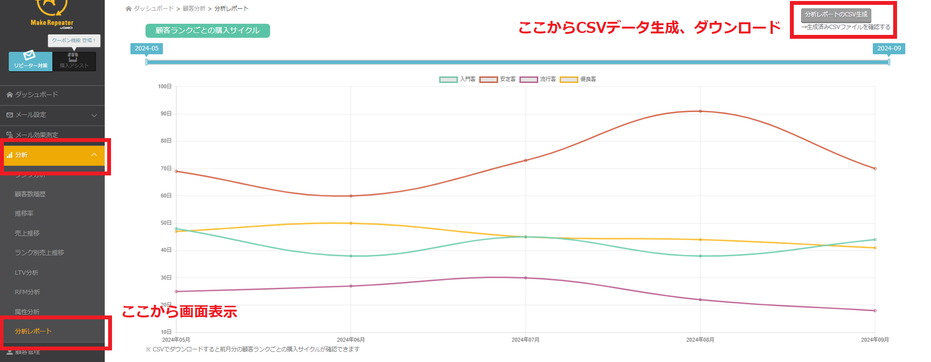 効果測定には「タイプ:かご落ち」として表示 |