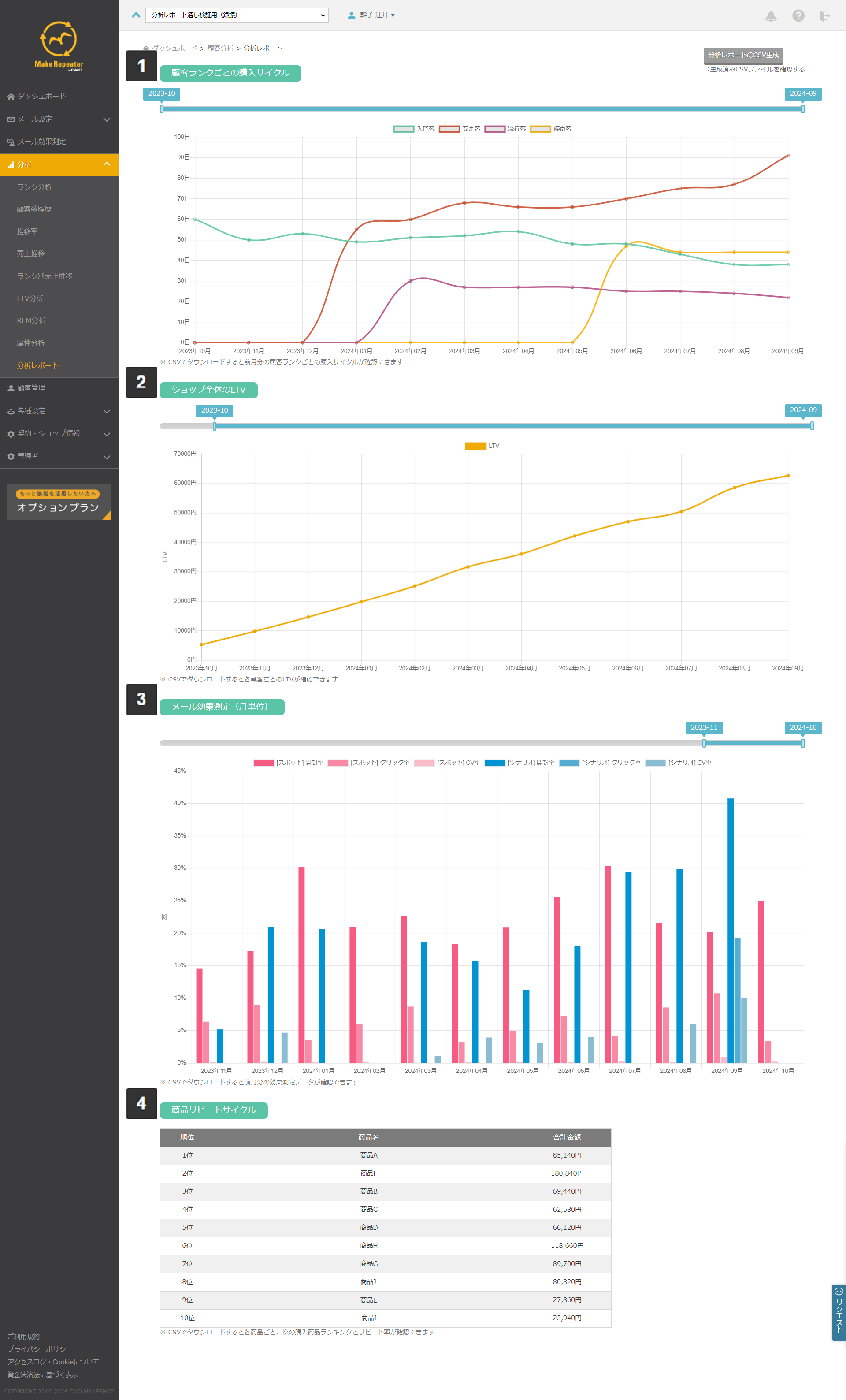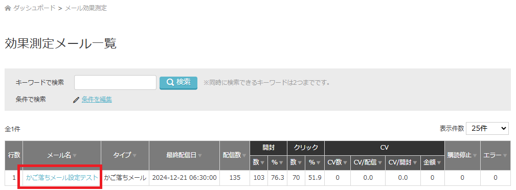 左メニュー:メール効果測定をクリックで、メール設定単位での結果一覧が表示されます。