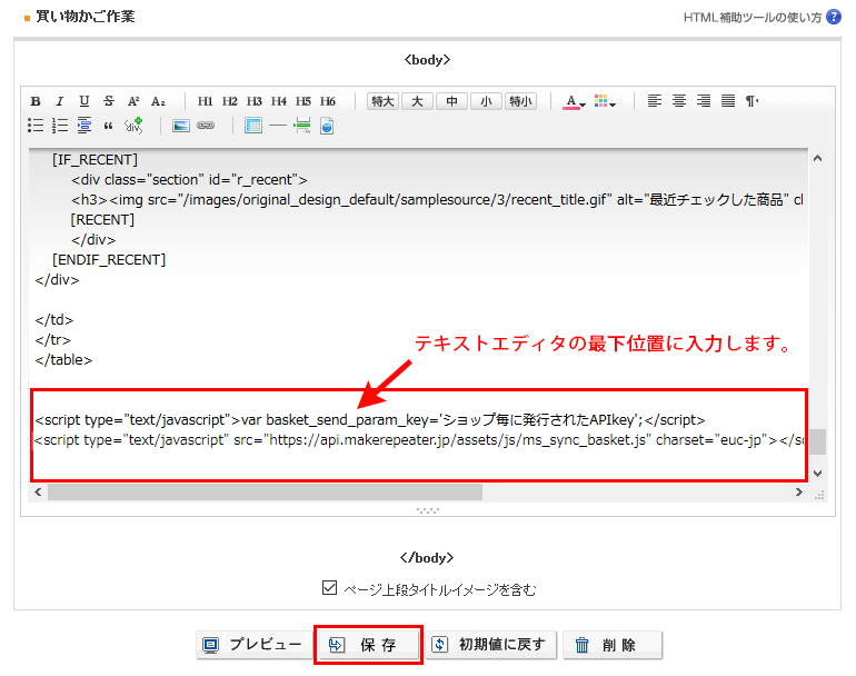 テキストエディタエリア内(最下位置)にタグを入力し「保存」ボタンをクリックしてください。