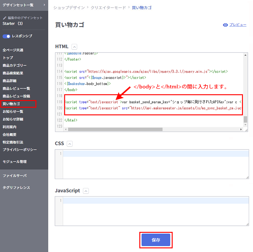 ショップデザイン / テンプレート選択・編集 / クリエイターモード / 編集するテンプレート「編集」「買い物カゴ」を開き、【HTML】テキストエディタエリア内にタグを入力し「保存」ボタンをクリックしてください。