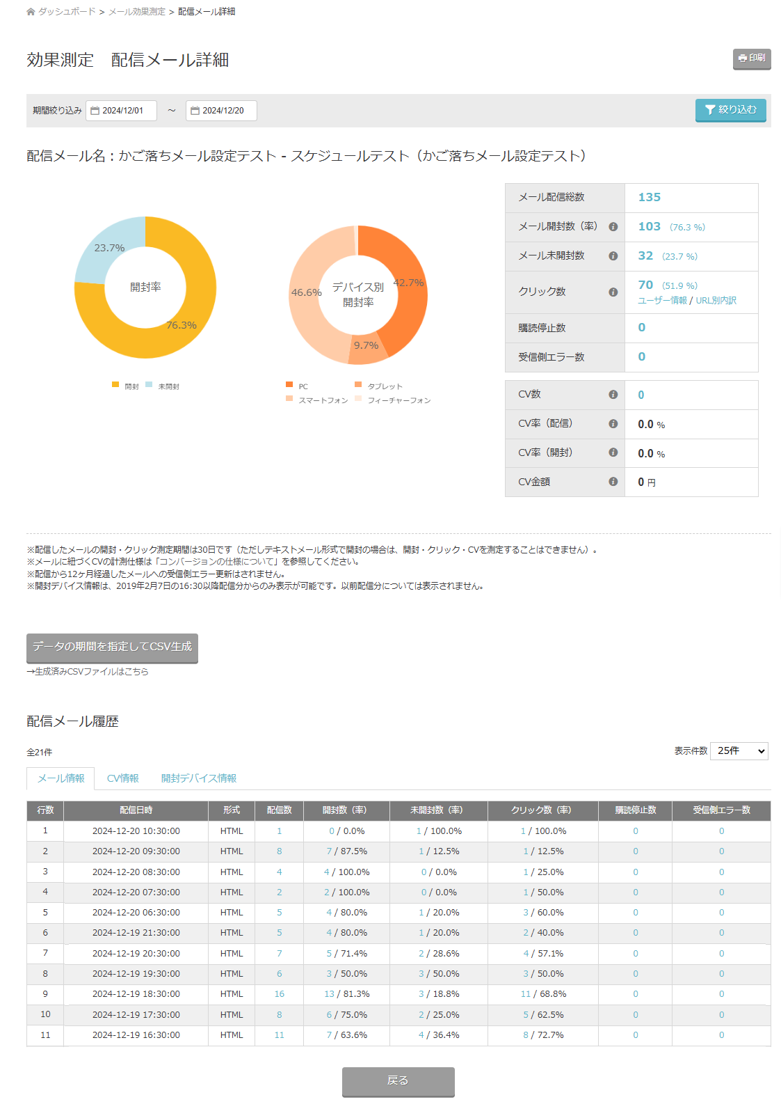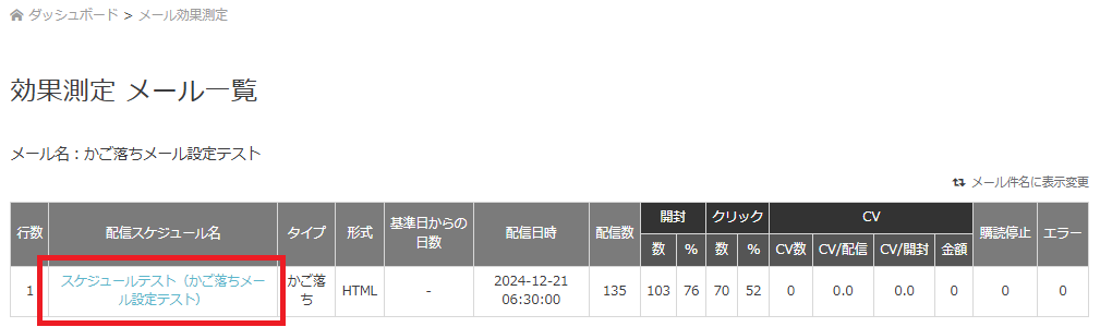 メール設定名称をクリックで、スケジュール単位での結果が表示されます。