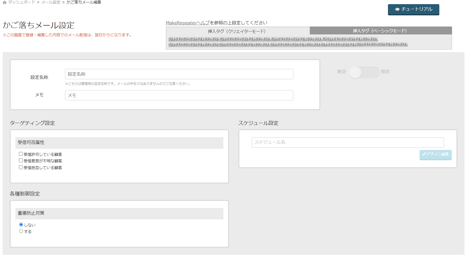 『 MakeRepeater管理画面>メール設定>かご落ちメール設定 』から、かご落ちメール設定画面を開きます。
