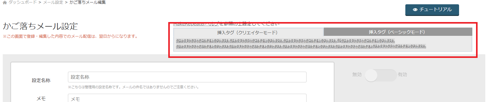 設置タグは、『 MakeRepeater管理画面>メール設定>かご落ちメール設定 』の画面上部に記載されてます。