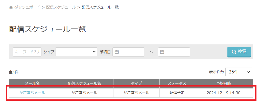 かご落ちメールのステータスを有効に切り替えた配信設定後、下記2カ所で当日配信分が表示されます。