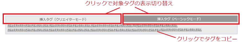 タグはクリックするとコピーできるので、該当ショップデザインのタグをコピーし、makeshop管理画面の設定に進みます。