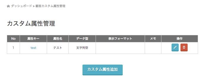 左メニュー > 各種設定の「カスタム属性管理」をクリックすると、以下の画面が表示されます。「カスタム属性追加」をクリックします。