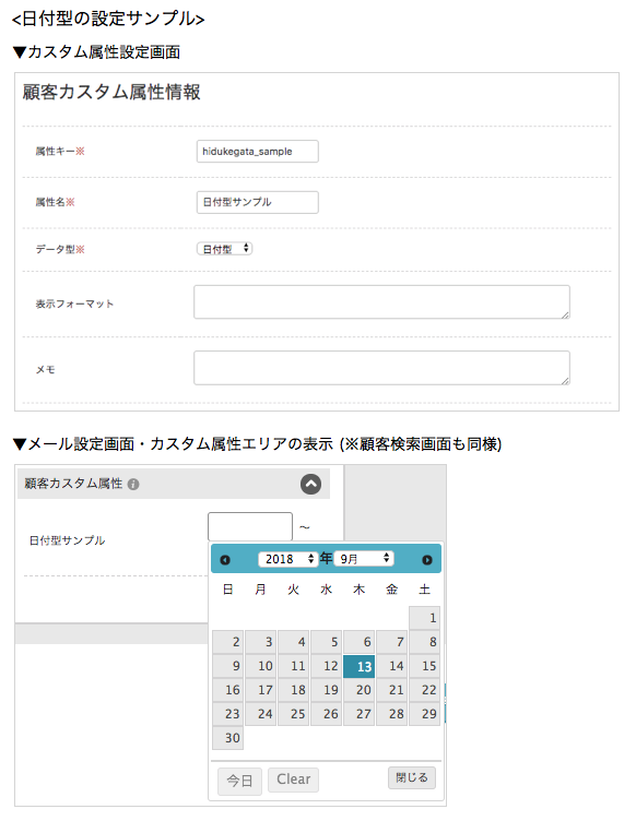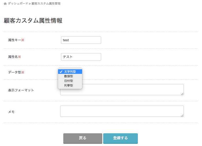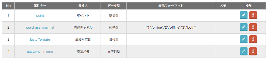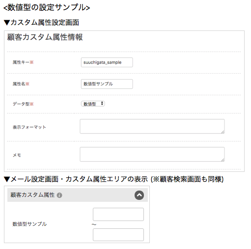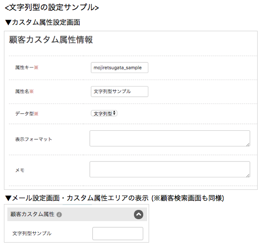 属性名: 半角英数または日本語で設定します。※顧客管理やメール設定など、各画面にて表示される項目名となります。