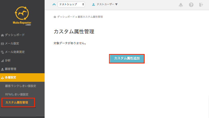 左メニュー: 各種設定 > カスタム属性管理で、顧客情報の追加項目として任意の項目を設定することができます。