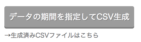 ご登録のメールアドレスあてにデータ生成完了通知が来たら、メール記載のリンク、もしくは「データの期間を指定してCSV生成」ボタン下部の「生成済みCSVファイルはこちら」から遷移する画面にて、該当のデータのダウンロードボタンをクリックすると、指定データをダウンロードできます。