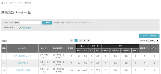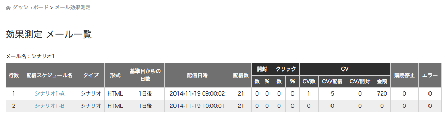 左メニュー:メール効果測定をクリックで、まずはメール設定単位の一覧が表示されます。