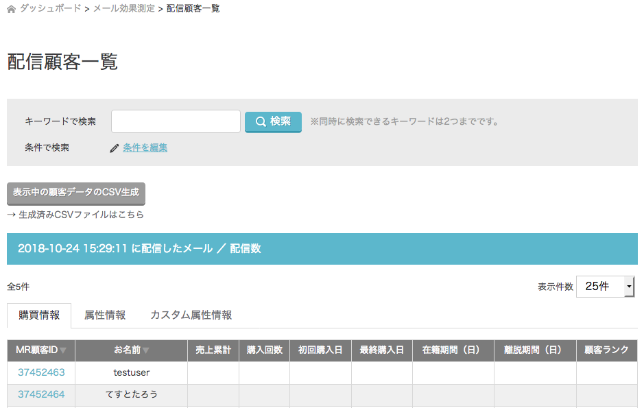①「ユーザー情報」をクリックで、配信対象顧客一覧が表示されます