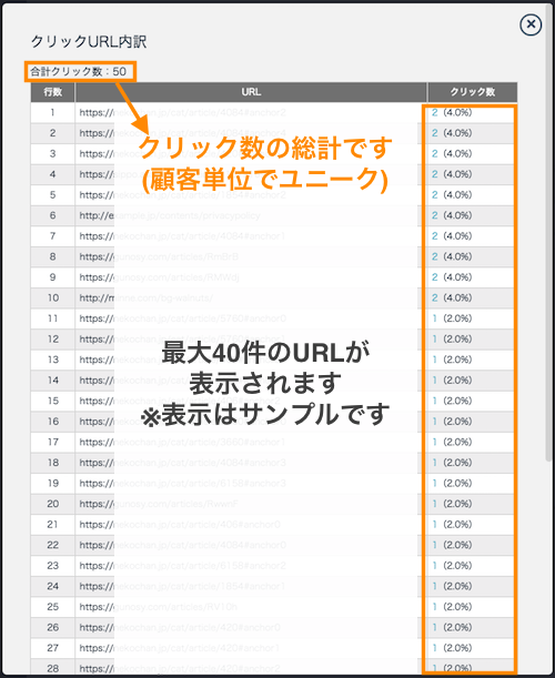 ②「URL別内訳」をクリックで、リンクURL別のクリック数内訳が表示表示されます