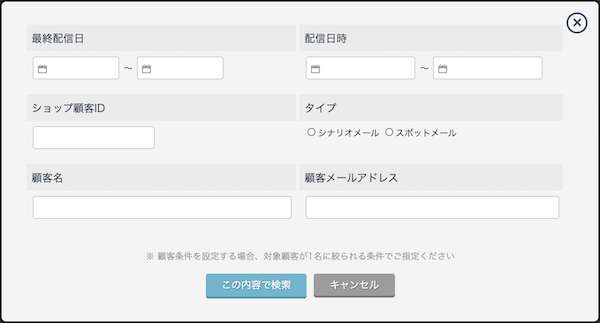 最終配信日、配信日時、ショップ顧客ID、タイプ(シナリオ、スポット)、顧客名、顧客メールアドレスを利用できますが、最終配信日と配信日時を併用することはできません。
