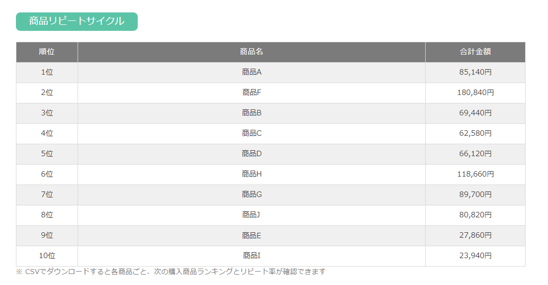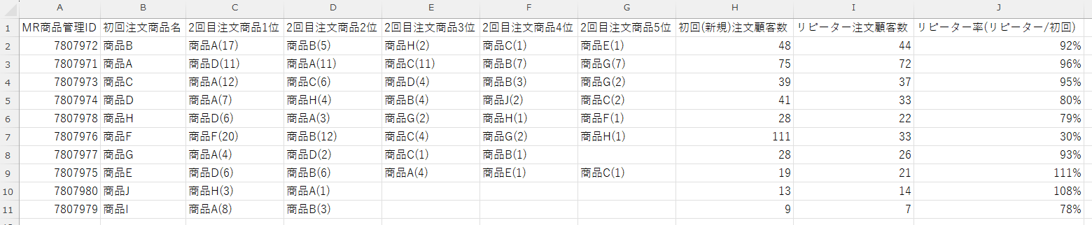 CSVデータでは、初回購入された各商品(導入商品)ごと、次の購入商品ランキングとリピート率が確認できます。