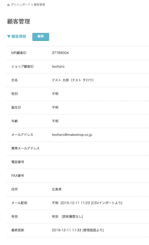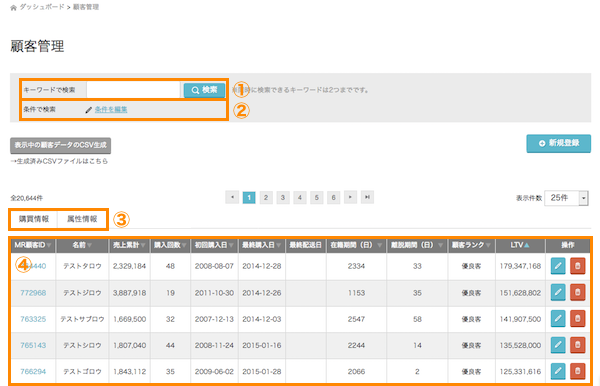 左メニュー:顧客管理をクリックで、顧客情報一覧が表示されます。顧客管理画面は、検索などが可能な一覧と、顧客単位で表示する詳細に分かれています。