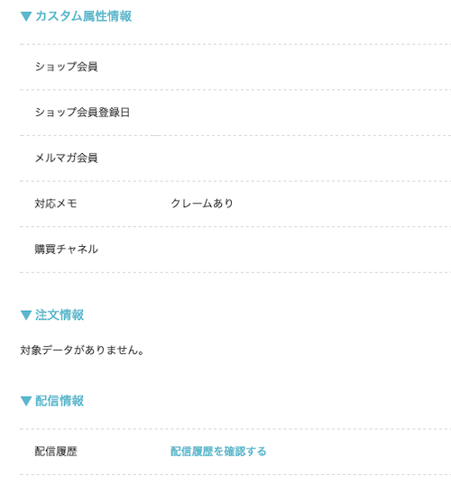顧客情報、カスタム属性情報、注文情報、配信情報の確認が可能です。