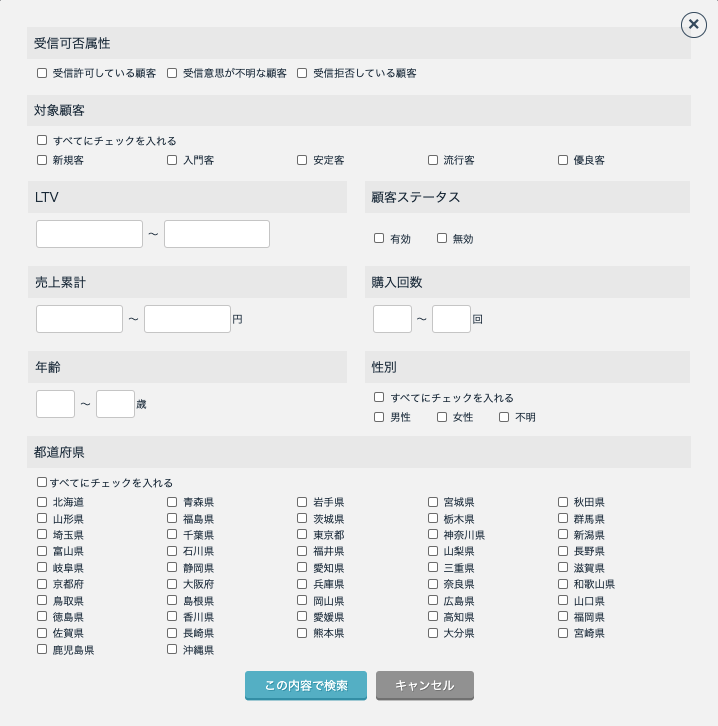 これらは、メール設定画面のターゲティング設定エリアと同じ選択方法となります。
