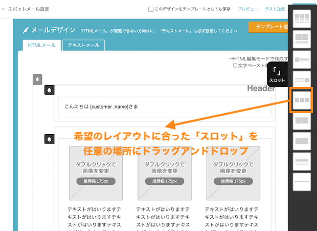 メールのコンテンツを構成する1つの単位です。スロットを複数組み合わせることにより、カスタマイズされたレイアウトでメールコンテンツをデザインすることが可能となります。